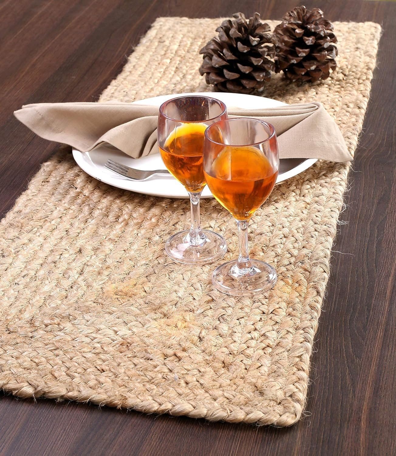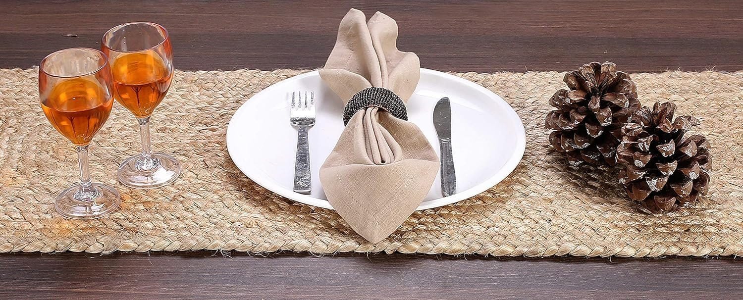 This handcrafted jute table runner is made from sustainably sourced 100% natural jute fibers.
